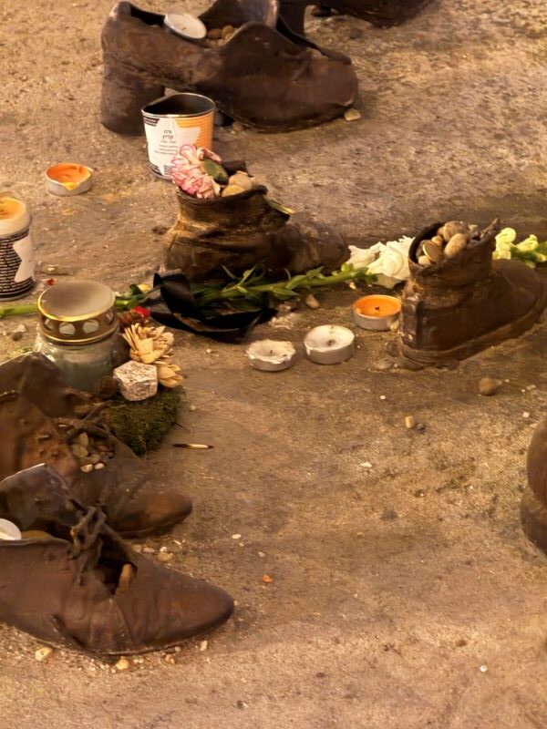 Conditions were horrific. Hunger, disease, and freezing temperatures claimed countless lives. Many others were taken from their homes and executed along the banks of the Danube River, their bodies thrown into the water. Today, the Shoes on the Danube Bank Memorial ( Cipők a Duna-parton) is a memorial erected on 16 April 2005, in Budapest, Hungary. Conceived by film director Can Togay, he created it on the east bank of the Danube River with sculptor Gyula Pauer [hu] to honor thousands of Jews massacred by the Arrow Cross Party in Budapest during the Second World War, winter 1944-1945. Victims were ordered to take off their shoes (shoes were valuable and could be stolen and resold by the militia after the massacre), and were shot at the edge of the water so that their bodies fell into the river and were carried away. The memorial represents their shoes left behind on the bank. 60 pairs sculpted out of iron – men, women, and children’s.